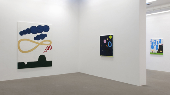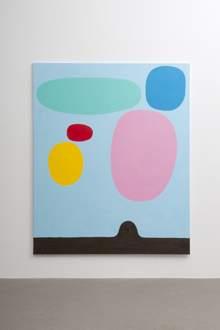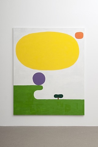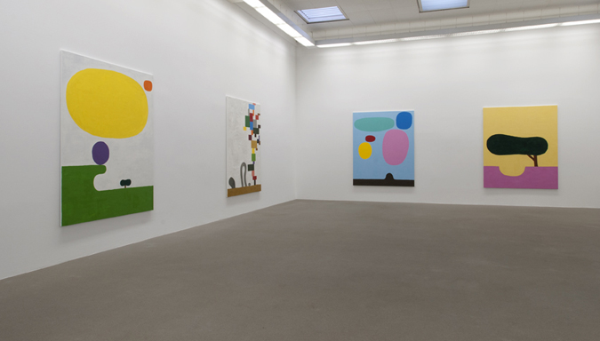 Antje Dorn Milkyway 18 January until 13 April 2013 The solo exhibition shows the recently completed "Milkyway" series of the Berlin-based artist Antje Dorn (b. 1964 Aachen). It encompasses 45 abstract landscape paintings and will be on view in its entirety. The opening will take place on January 18th, from 6 pm to 8 pm. Antje Dorn will be present. Exhibition Text From 18 January to 13 April 2013, Galerie m Bochum will show its first solo exhibition of the works of Antje Dorn (b. 1964 in Aachen). The Berlin-based artist’s recently completed “Milkyway” series, encompassing 45 abstract landscape paintings, will be on view in its entirety. In this new series, Dorn focuses on “gazing at the sky,” as she herself puts it, and which the title also hints at. And in fact, the area above the horizon is where the action takes place in the majority of the pictures. Multiple shapes in vibrant colors sprawl across each canvas. Geometric or amorphous forms stand out in a kind of close-up against a monochrome ground sometimes piling up to form structures. In most cases they are arranged on surfaces that recall landscape silhouettes, while at other times they seem to float in the pictorial space or firmament. Some of these forms summon immediate associations with trees, clouds or the sun, but others remain ambiguous and enigmatic. They are reduced to essentials, partaking in the same symbolic quality found throughout the artist’s work. Antje Dorn does not set out to execute a naturalistic representation of an object, but rather creates a simplified depiction using icons to symbolize certain phenomena in our world of things. As a result, we see the vertical brown stripes topped by a rounded green blob as a tree. It is not only color and shape, however, but also context that helps us to interpret what we see in figurative and narrative terms. Dorn is inspired here by an aesthetic we are familiar with from comics and similar pictorial genres. The individual components of a picture are set side by side, isolated from one another, through which they convey their autonomy. Their surfaces are made up of bold monochromatic colors. The artist makes little use of painterly perspective and renounces atmospheric lighting effects entirely. The pictures are hence self-referential; they do not show a space defined by clues to depth, but instead develop their message on the flat painted plane. This flatness is reinforced by the marked traces left behind of the application of paint, which lends a tactile quality to the works. They derive their physical presence from the impression of simultaneous lightness and heaviness, intensified further by a feeling of equilibrium. Dorn’s paintings exude a light-hearted, humorous aura through apparent interactions and mutual influence between the individual elements, which hence become protagonists in their own unique world. In their respective constellations, they convey occurrences that seem quite matter-of-fact and inevitable. And seen together as a group, they present an animated, surrealistic panorama. |