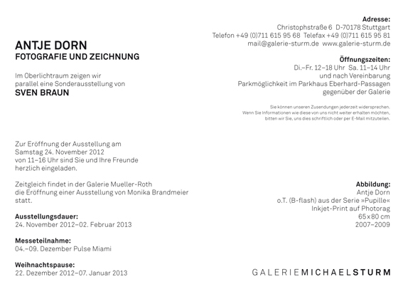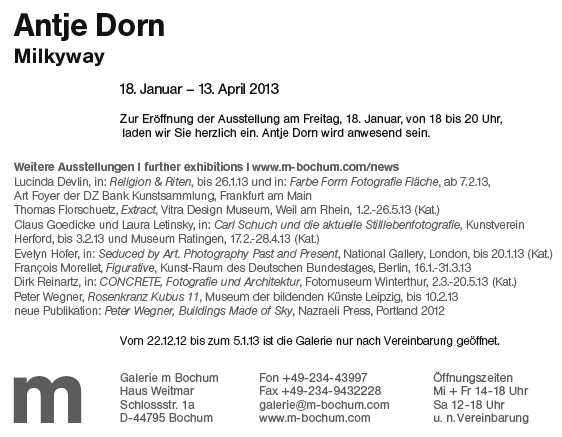 | Galerie m Bochum | Schlossstr. 1a | 44795 Bochum Germany F +49-234-43997 galerie@m-bochum.com www.galerie-m-bochum.com |
