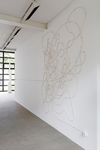 | Antje Dorn "Dirtycube II" Kabel, Kabelschellen, Steckdosen, ca. 270x525, in der Ausstellung "Blank_Space" Galerie m Bochum, 2014 |