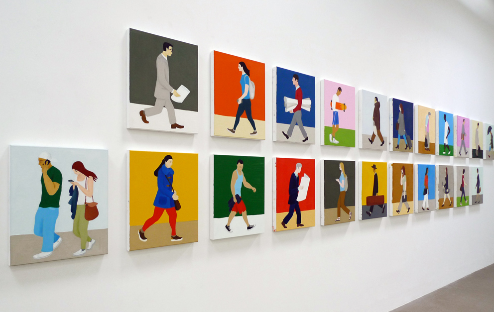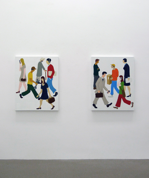 Antje Dorn Passage Galerie m Bochum 7. September 22. Dezember 2017 Die Galerie m Bochum zeigt mit der Ausstellung „Passage“ die neue Malereiserie der in Berlin lebenden Künstlerin Antje Dorn (*1964 Aachen). Die 45 Ölgemälde unterschiedlichen Formats entstanden zwischen 2015 und 2017 und thematisieren den gehenden Menschen, so wie man ihm in der Stadt täglich begegnet. Mit der Serie „Passage“ widmet sich Antje Dorn der wohl selbstverständlichsten Bewegungsart des Menschen. Paradoxerweise bleibt der Charakter der Gemälde, mit den festen, konzentrierten Pinselstrichen und den abgegrenzten und sorgfältig komponierten einfarbigen Flächen, dennoch ruhig und statisch. Die Bilder zeichnen sich durch Dorns spezifische Formensprache aus, mit der sie ihre Figuren vereinfacht, mit wesentlichen Attributen versieht und gleichzeitig typisierend darstellt. Ein Fries aus 32 kleinformatigen Bildern zeigt jeweils ein bis zwei voranschreitende Personen im Profil. Die Gesichter sind nur leicht angedeutet ohne individuelle Züge. Der zweigeteilte Hintergrund schafft mit der Andeutung eines Untergrundes einen minimalen Raumeindruck und lenkt die Aufmerksamkeit auf die Gehenden, die sich in Alter, Geschlecht, Hautfarbe, Körperbau und -haltung unterscheiden. Die Kleidung sowie die gewählten Accessoires lassen auf einen städtischen Kontext schließen und definieren verschiedene Typen. Gerade diesen Details wohnt eine Zeichenfunktion inne. Aus wenigen Hinweisen entwickeln sich Assoziationen rund um das Wesen und die Umstände der dargestellten Fußgänger. Immer wieder findet sich der für Antje Dorn so typische humorvolle Umgang mit dem Sujet, wenn etwa eine elegant gekleidete Frau mit zwei großen Schraubenschlüsseln unterwegs ist und damit thematisch an die Zeichnungsserie „Motorgirls“ erinnert. Weitere, zum Teil großformatige Werke der Serie, auf denen die Schreitenden vor einem monochromen Bildgrund zu schweben scheinen, weisen einen freieren kompositorischen Aufbau auf. Dorn nutzt hier ihre Gestaltungsmittel spielerischer und schafft mit der Wahl von Größe und Platzierung der einzelnen Figuren Räumlichkeit oder neue Gewichtungen. Durch den Verzicht auf eine konsequente perspektivische Darstellung wirken die Bilder manchmal wie collagiert, insbesondere durch das wie zufällig wirkende Nebeneinander der Passanten. Hier wird die Anonymität der Großstadt spürbar. Die Protagonisten telefonieren, blicken oder tippen während des Gehens auf ihr Smartphone, andere tragen Sportbekleidung oder halten Einkaufstaschen. Das zielgerichtete, auf sich selbst konzentrierte Verhalten offenbart Eigenheiten, die sich bei vielen Zeitgenossen und möglicherweise auch bei uns wiederfinden. Die „Passage“- Bilder sensibilisieren uns, einmal mehr mit einer für Antje Dorn typischen Leichtigkeit, für Alltagsphänomene in der uns umgebenden Gesellschaft und Welt.english version